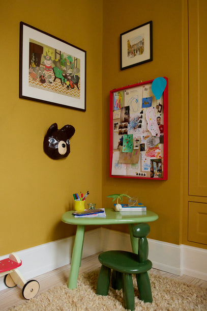 Personal pictures and cute drawings hang on the pin board, with its cherry red colour is a wonderful contrast to the yellow walls.