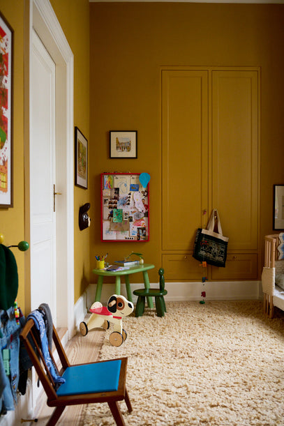 Nanna, Axel's mom, fell in love with Thorvaldsen's Museum while being pregnant with Axel, and decided then that Axel's room should take inspiration from there. The result: Warm yellow walls and long, yellow, shiny curtains that almost embrace you as you enter.