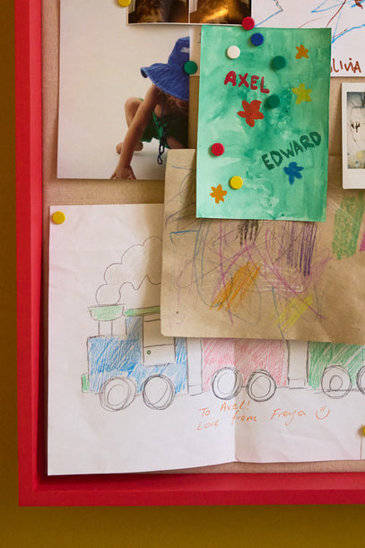 Above, a cherry red pin board where Axel keeps drawings, pictures and other small treasures.