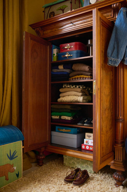 A pair of Axel's loafers in front of the vintage cupboard. Inside; Axel's wardrobe consisting of knits, including our own cashmere sweater, jeans, shorts, pants and t-shirts next to toys and games.
