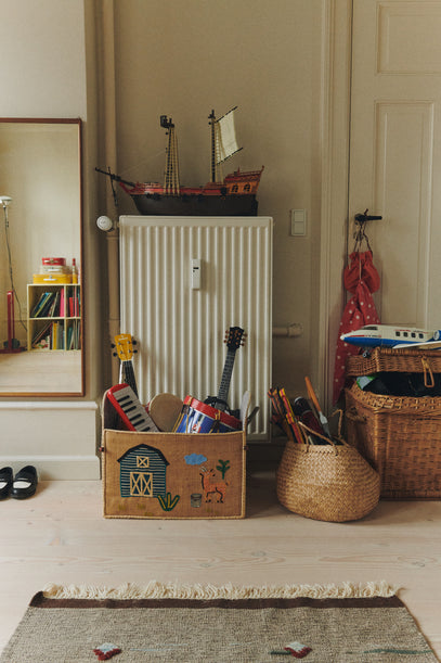 Musical toys, here stored in a raffia basket. Explore our selection of raffia baskets here. Inside the basket is a guitar and a classic drum.