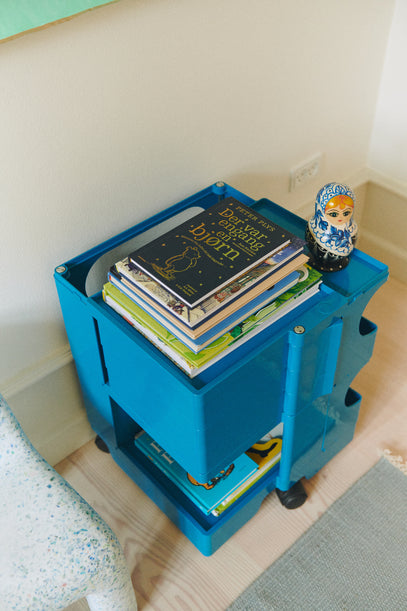 A bright blue Joe Colombo trolley is used for storage. On top, 'Der var engang en bjørn' Winnie the Pooh book from Gyldendal.