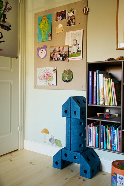 Pictures and little paintings are saved on the pinboard that Malte's mother made years ago, using a masonite board and covering it with linen. The MODU elements on the floor are transformed into a rocket.