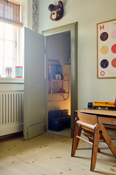 The old built-in cupboard has been turned into the loveliest little nook. A soft wall-to-wall rug, MODU elements turned into a small bench and a light on the floor give this space a cosy feeling. Malte loves to spend time in here.