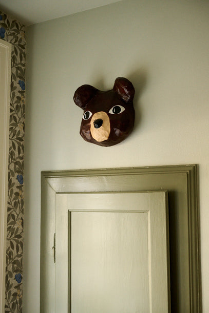 The papier-mâché bear hangs beautifully above the green door that opens up into the nook. The wall is painted with colour "Viggo", and the door is painted with "Greenpoint". Both from Flügger.