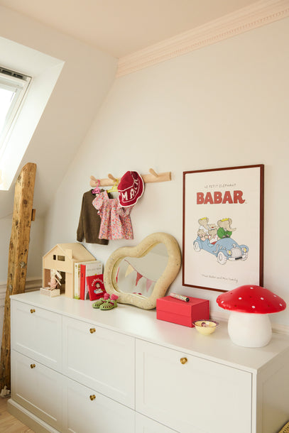 Details from the bedroom: A kaleidoscope, a Hako Storage Box, a bowl to keep pacifiers and a large red mushroom lamp, which is turned on every night at night time.