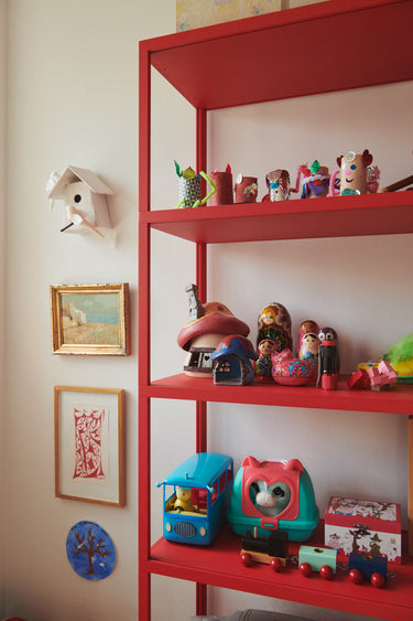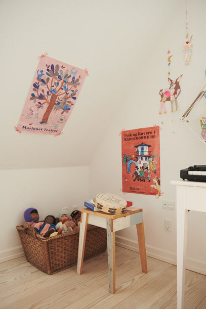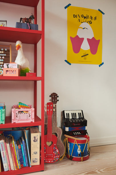 Pixi's books are lined up on the lower shelf. Also here: The Duck Lamp, a red ukulele and a drum. Posters on the wall are easily hung with tape on the corners.