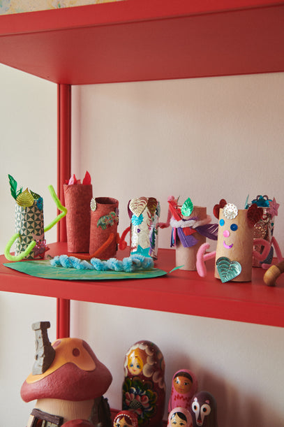 A selection of Pixi's figures sit on the shelf. Each one of them is handmade by Pixi herself, who has been creative using pearls, feathers, toilet paper rolls and more.