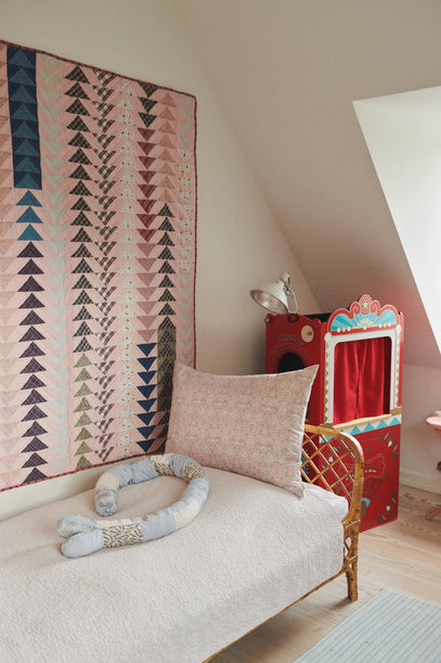 A colourful quilt hangs on the wall above the bed, and gives a cosy and warm feeling to the room. The bed is vintage, but the Boheme Bed from Bonton has a similar feel.