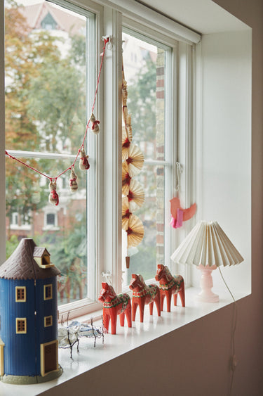 Little cute paper ornaments from Danish artist Sarah Becker are placed on the wall.