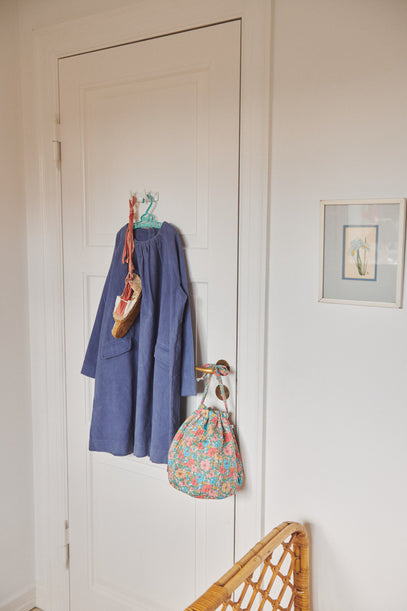The Malika Dress, little shoes, and a Liberty Pouch hangs on the back on the door, waiting for the perfect occasion to be worn.