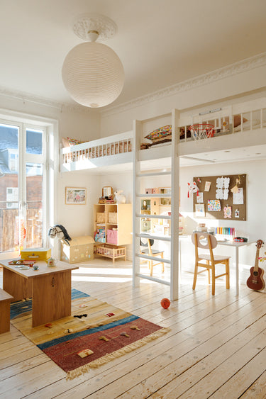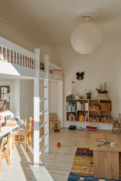 Rays of light shine through the windows in the Copenhagen apartment on the 4th floor, and brings warmth and light into Sonja, 2, and almost 6-year-old Roberta's shared room.