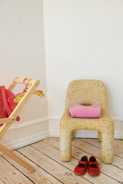 A Charlie Chair in vanilla is placed in the corner next to a pretend play drying rack. On the chair lies a cashmere sweater in pink.