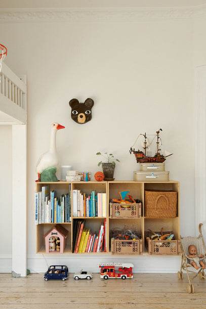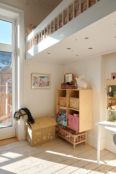 The space underneath the bunk bed is cleverly used for storage and space to play. Here, a raffia box on the floor is used to store toys – find similar raffia boxes here – and a little shelf makes for a great place for the bunny lamp.