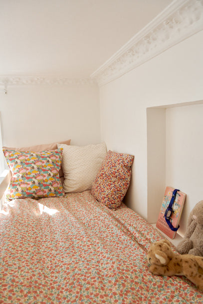 Roberta's cosy end of the loft bed, with lots of large, soft pillows, a couple of teddies and a book. Explore our book selection here.
