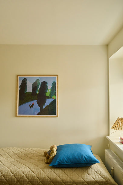 Vincent & Rose's shared bed, made up for day, with a large blue pillow. Above, the poster 'Pimme & Nissen på Eventyr'