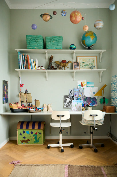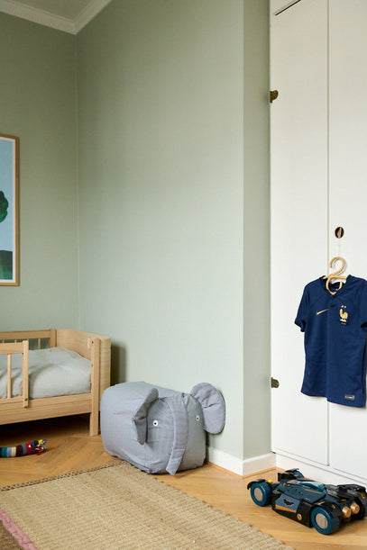 The walls have been painted with 'Cromarty' from Farrow and Ball – a different colour from the rest of the home to illustrate that this is Theo's room. The light green pairs well with the 'Elefanterne Gemmer Sig' poster.