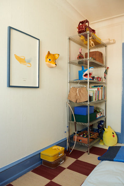 On the wall hangs a fox papier-mâché mask; on the floor below are two colourful suitcases. The checkered rug is from Layered.