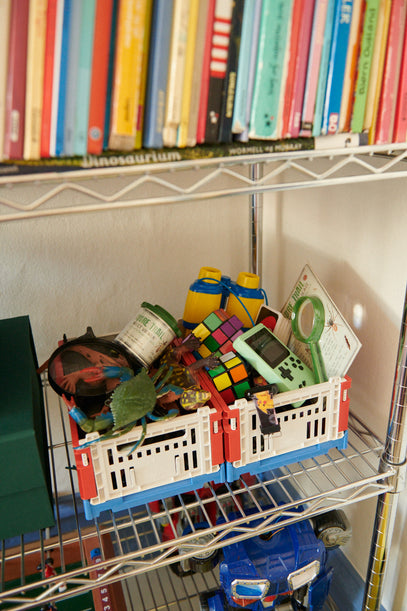 On the shelf below the books: A bright blue and green storage box with lid to store smaller items.