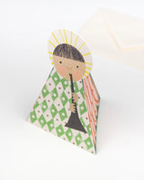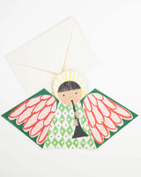 Wish someone you love a merry Christmas with this lovely fold-out card – or fold it and use as Christmas decor in your own home: This is a sweet choir angel card iwith fold-out wings so it stands beautifully on display.