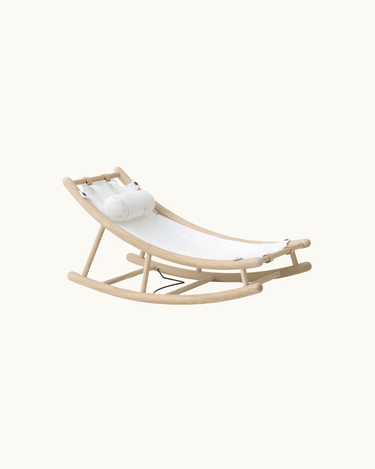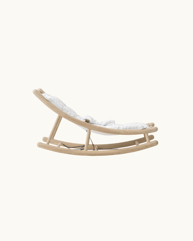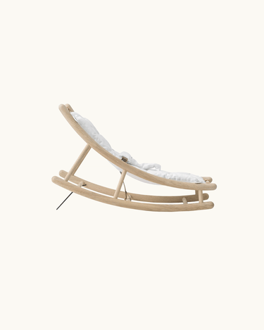 Made from a white-oiled oak frame. Baby cushion and toddler seat are made of Oeko-Tex cotton with a filling made of Oeko-Tex recycled PET. The baby cushion is attached to the toddler seat with velcro, and the toddler seat is attached to the baby & toddler rocker with press studs and the baby & toddler rocker's leather straps.