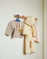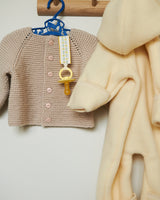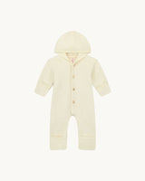 A classic baby suit that comes with a hoodie, rounded neck, classic fit and long sleeves. It comes with wooden buttons that go down the front.
