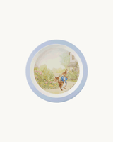A beautiful melamine dinner plate decorated with illustrations of Peter Rabbit.