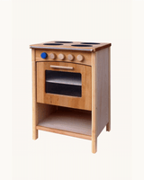 A beautiful, handmade wooden kitchen that comes fully equipped with 4 hobs, one doors that open and close, little knobs that turn, and a shelf inside the oven that moves.