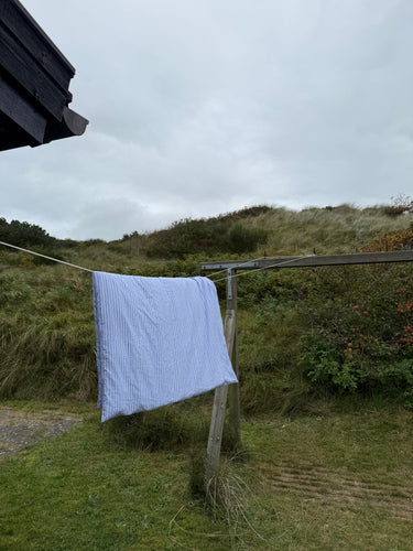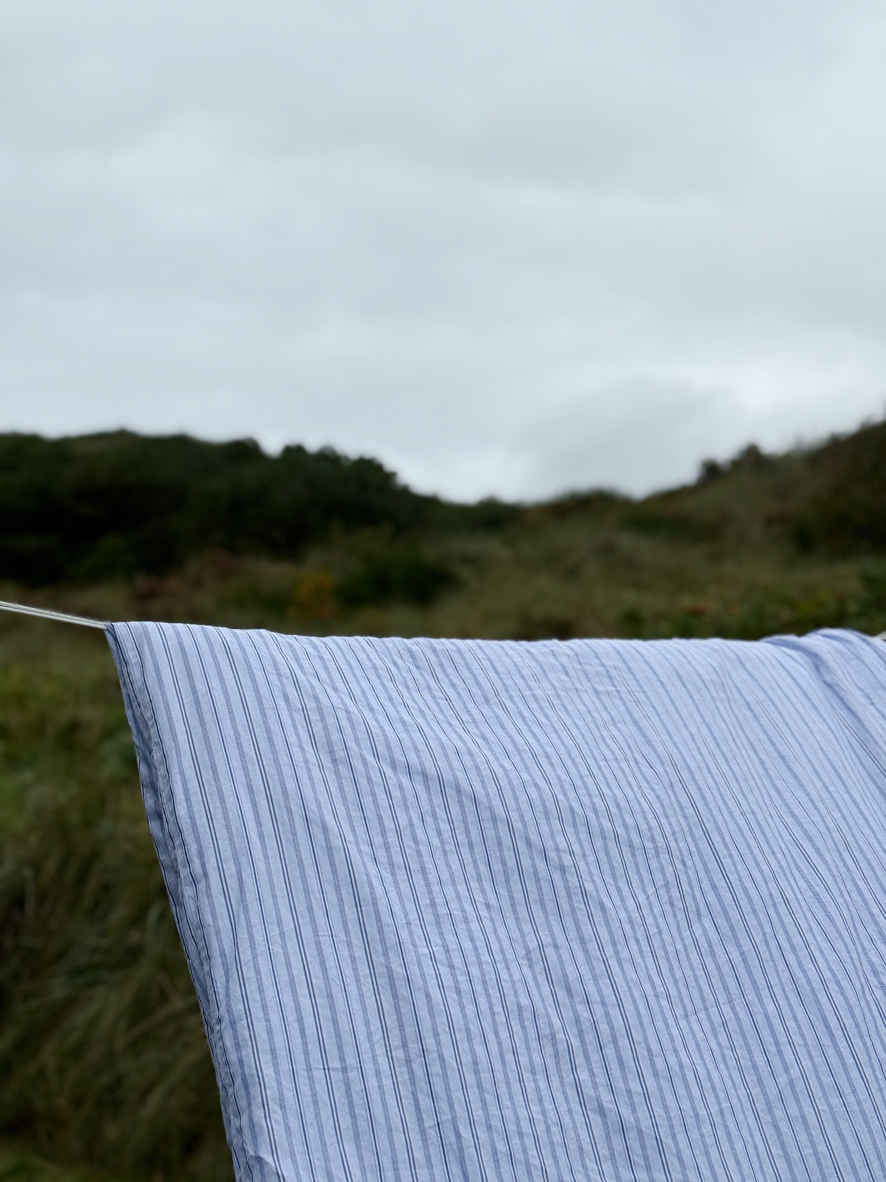 A soft, organic cotton junior bedding set, made in a beautiful striped deadstock fabric. This set includes a duvet cover with a matching pillow cover.