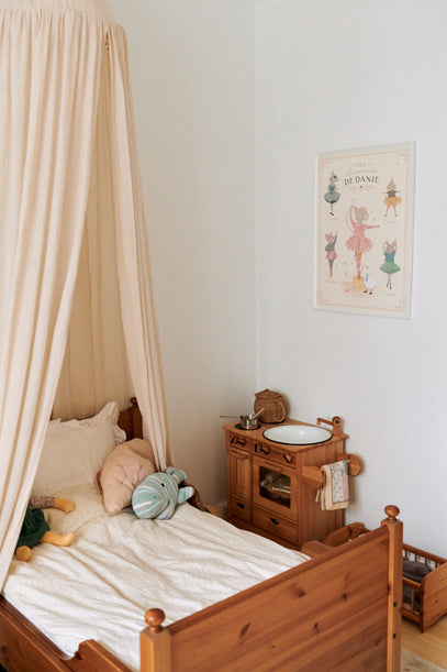 4-årige Ellie og 2-årige Cornelia deler et skønt værelse, der er indrettet med kærlighed til afdæmpede farver, varme materialer og med intentionen om at holde stemningen blød, rolig og varm.