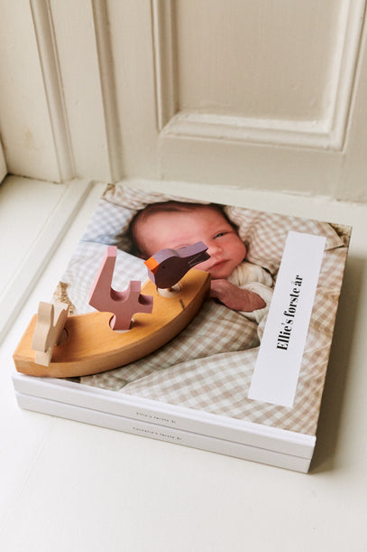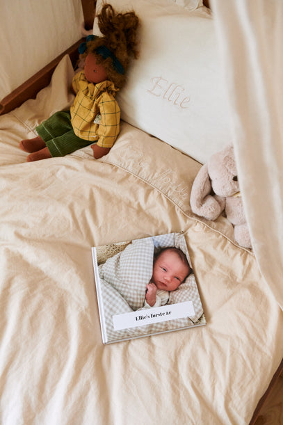 'Ellies første år' i printet format – en bog, hun kommer til at tage med sig gennem livet. På sengen ses også en blød kaninbamse samt en pude med broderet navn på.