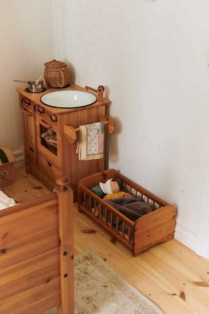 En blød gul dukke ligger i den lille dukkeseng. Både Ellie og Cornelia elsker at lege i det lille hjørne. En lille lyserød raffia kurv anes ved siden af køkkenet.