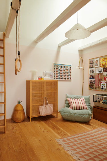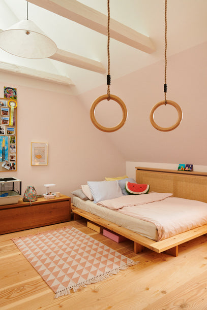 Ellies seng, som er fra det nu lukkede Studio X, står i hjørnet. Tæppet foran sengen er fra Liewood (find et lignende her), og hjælper til med at definere soveområdet. Gymnastikringe hænger fra en bjælke og bruges flittigt.