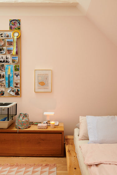 Ved siden af Ellies seng står et duftlys fra Minois, der giver en skøn og delikat duft, selv når det ikke er tændt. Her ligger også en fugtgivende creme, også fra Minois, og en hvid bordlampe, som bruges primært lige inden sengetid.