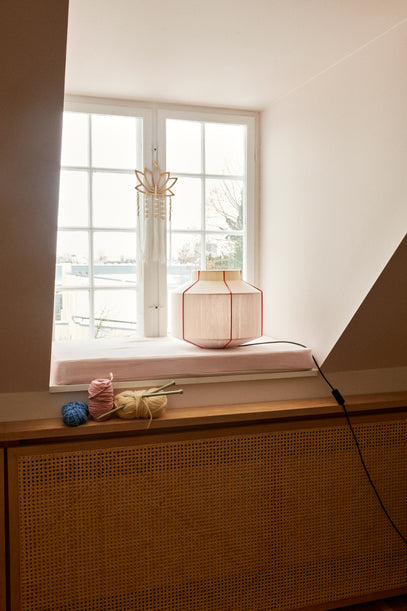 En lyserød hynde er placeret i vindueskarmen, hvilket gør den til et hyggeligt sted at sidde og læse, hækle eller snakke. Her står også en Bonbon Shade lampe, som er designet af Ana Kras og produceret af Hay.