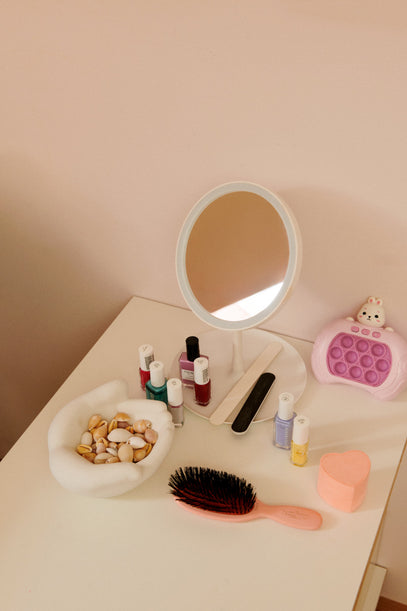 På bordet står en lille skål formet som en hånd, fyldt med skaller, der minder om sommer og sol. Ved siden af en samling neglelakker og en lyserød børste fra Mason Pearson.