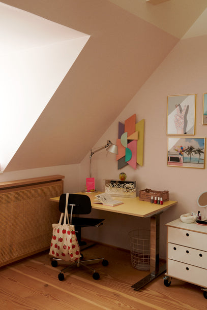 Det lysegule skrivebord kommer oprindeligt fra Cecilie Bahnsens kontor, og nu står det her, og er det primære møbel når Ellie er kreativ eller laver lektier. Her ses også en Kevi Stol fra Montana, og en Tolomeo Lampe fra Artemide.