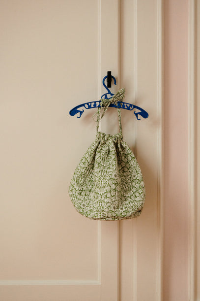 En Liberty Pouch bruges til opbevaring af garn og andre hækleting. Den hænger på et dørhåndtag med lidt hjælp fra en bøjle.