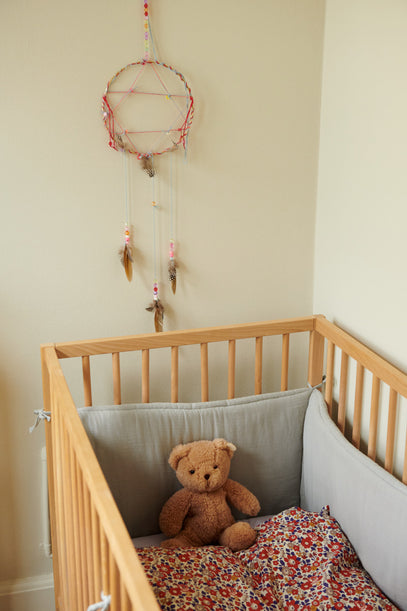 Francas tremmeseng er fra IKEA og den lysegrå sengerand fra Bonton gør, at hun sover blødt og rart. Det blomstrede dynebetræk i Libertyprint er fra Liberty by Lyngholm, og på puden sidder en blød og sød brun bjørn.
