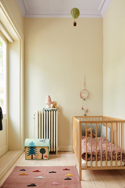 På gulvet ligger det håndlavede gulvtæppe 'Hat Rug' og foran den fine gamle radiator står en raffia kurv fra Rice, som bruges til Francas bløde legesager.