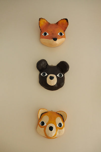 De håndlavede papier-mâché masker hænger smukt på væggen mellem de to vinduer. Fra toppen og ned: Ræven, bjørnen og den røde panda.