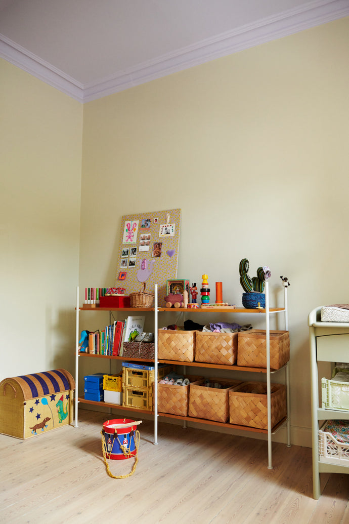 Francas tøj opbevares i bambuskurve i reolen, let tilgængeligt fra puslepladsen ved siden af. Øverst på reolen er der plads til alle Francas fine ting, herunder trælegetøj, en picnic kurv, en xylofon og en gul sut til når hun skal sove.