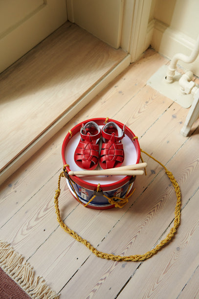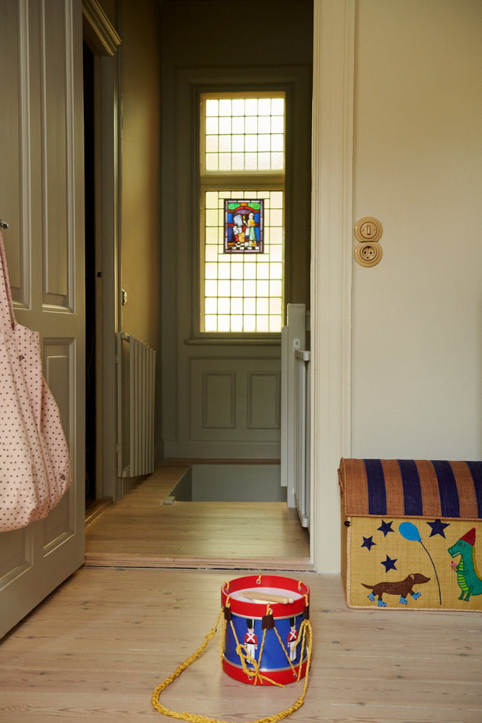 En tote taske fra Bonton hænger på døren (lyserød er udsolgt, se en lignende her); på gulvet står en raffia kurv fra Rice, og en klassisk tromme står klar til leg.