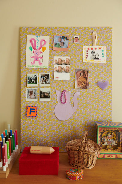 Opslagstavlen er beklædt med Liberty stof, og her hænger billeder af familie og venner og andre fine små minder.