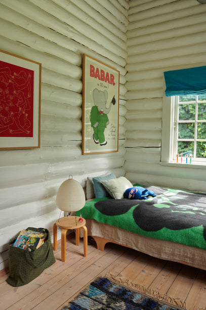 Over sengen hænger en Babar plakat, der er blevet indrammet, og på sengen ligger en mørkeblå strikket hval. Puderne er gamle og fra Bonton. Den lille skammel er fundet brugt og lampen er fra Vitra, designet af Isamu Noguchi.