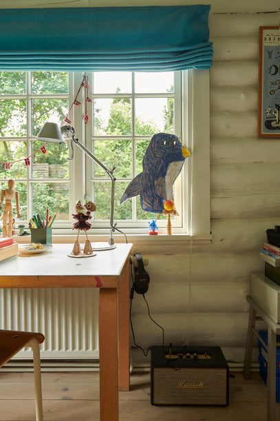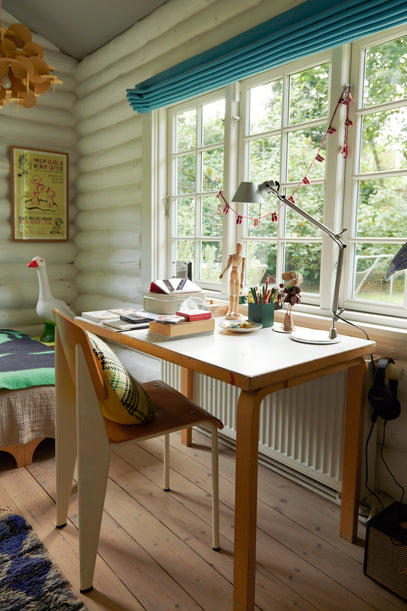 Et ældre Alvar Aalto skrivebord står ved vinduet, hvorind der strømmer det dejligste lys og gør det til et skønt sted at læse eller tegne.