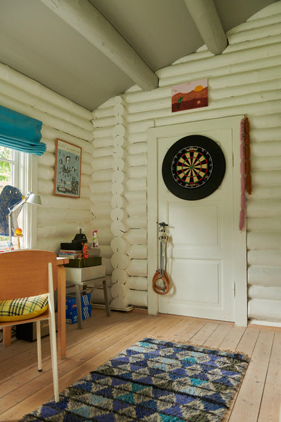 Gilberts værelse er et hjørneværelse, hvor lyset strømmer ind og hvor der er udkig til den grønne have fra 2 store vinduer. De hvide bjælker gør, at alle farver popper, men midt i mellem farver og tuscher og spil og andet godt emmer her stadig af ro og Skandinavisk enkelthed.