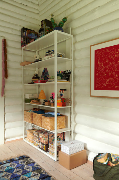 Det er også her i reolen at Gilbert har sit tøj. Det er lagt i kurve for at holde en smule orden, og så det er let at komme til. Her anes lige akkurat Avala sweateren fra Caramel, og vores egne bomuldsbukser, fremstillet af deadstock stof fundet i Italien.