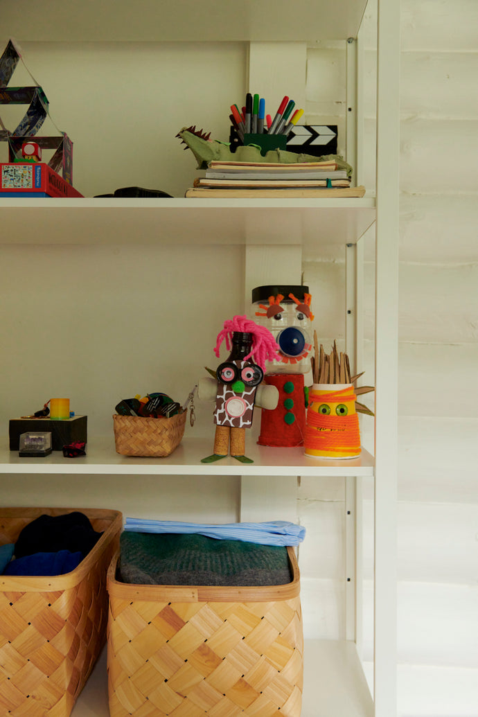 Den hvide reol er fra IKEA og bruges til alt fra små figurer lavet af sættet Funny Monster-Mix fra Creativ Company, et korthus Gilbert selv har lavet, flere tegneting bl.a. tuscher fra Creativ Company, og Hot Dog puslespillet.
