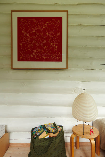 Gilbert fik det røde silkeprint, lavet af kunstneren Ai Weiwei, i 12-års fødselsdagsgave. Sidenhen blev det indrammet og hænger nu på væggen mellem reolen og sengen.